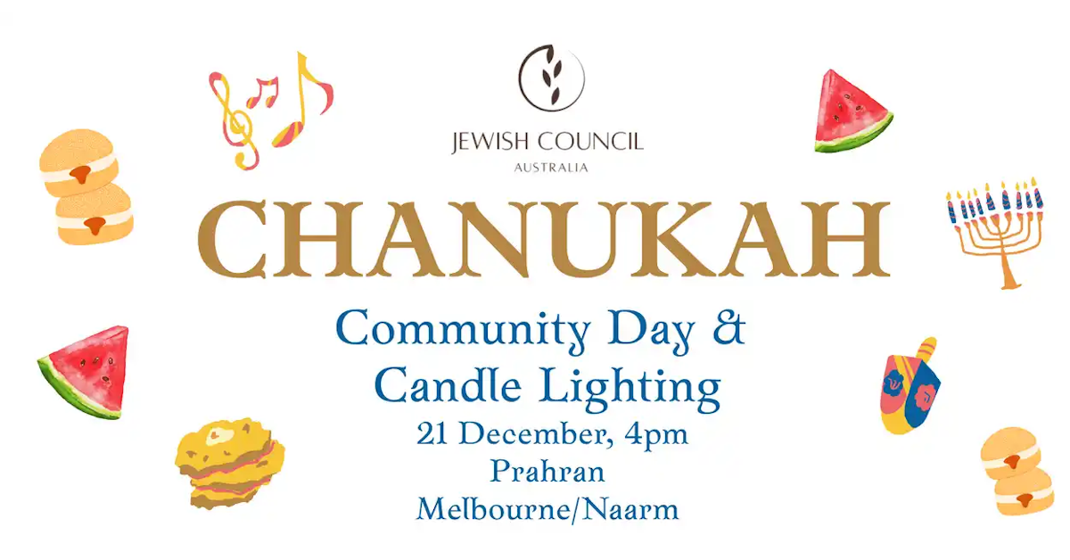 The Jewish Council of Australia invites you to a community Chanukah gathering and pot luck dinner! There will be something for everyone: discussions, candle making, latke cooking (and eating!), kids activities, crafts, more eating, dreidel spinning, and lighting chanukiot. All are welcome as we gather, eat, and remember that together we can create light and hope even in our darkest moments.